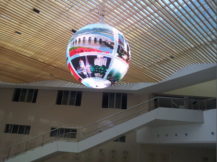 LED球形屏360°全可视角度,全方位播放视频,任何角度都能感受到良好的视觉效果,无平面视角问题。同时它也可以根据需要把球形物体如地球,足球等直接影射到显示屏上,让人感觉惟妙惟肖,广泛应用于博物馆、科技馆、展览馆。