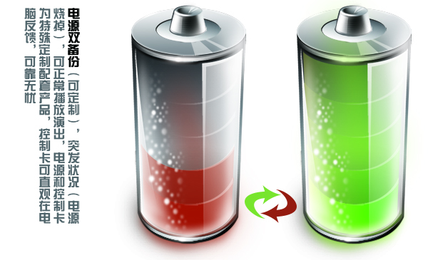 此外鑫彩晨的所有产品中都有着鑫彩晨独家专利的各项技术,针对LED租赁显示屏更是拥有电源双备份技术,此技术能保证产品在使用期间不会因为断电而停止对演出造成影响。